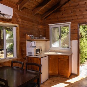 בקתות העץ, גודלן כ- 50 מ"ר. בכל בקתה תמצאו מיטה זוגית מרווחת עם מזרון אורתופדי, מצעי סטן איכותיים ושמיכות פוך, ג´קוזי גדול הממוקם מול המיטה, טלוויזיה, מערכת ישיבה נוחה, מזגן, חדר רחצה, פינת אוכל מזמינה, מטבחון עם מקרר ובו חלב לשימושכם, מיקרוגל, כיריים חשמליות, קומקום חשמלי, קפה ותה צמחים.